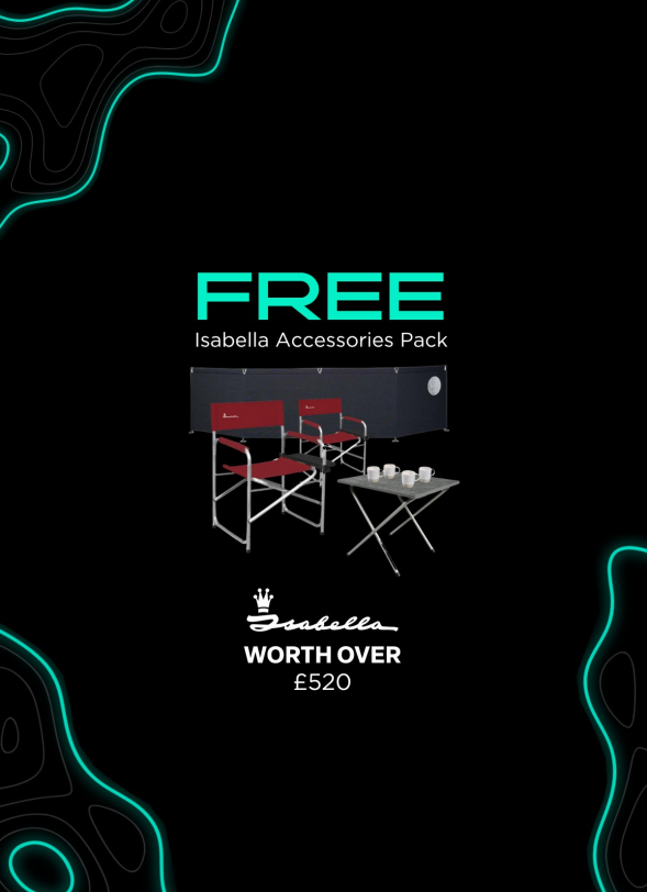 Purchase a brand new Xplore campervan (25 or 26 Model Year) between 14th and 19th October – either at the NEC Caravan Shows Motorhome & Caravan Show, NEC Birmingham or from any of our approved Xplore retailers nationwide – and we will give you a FREE Isabella Camping United Kingdom Accessories Pack worth over £520.