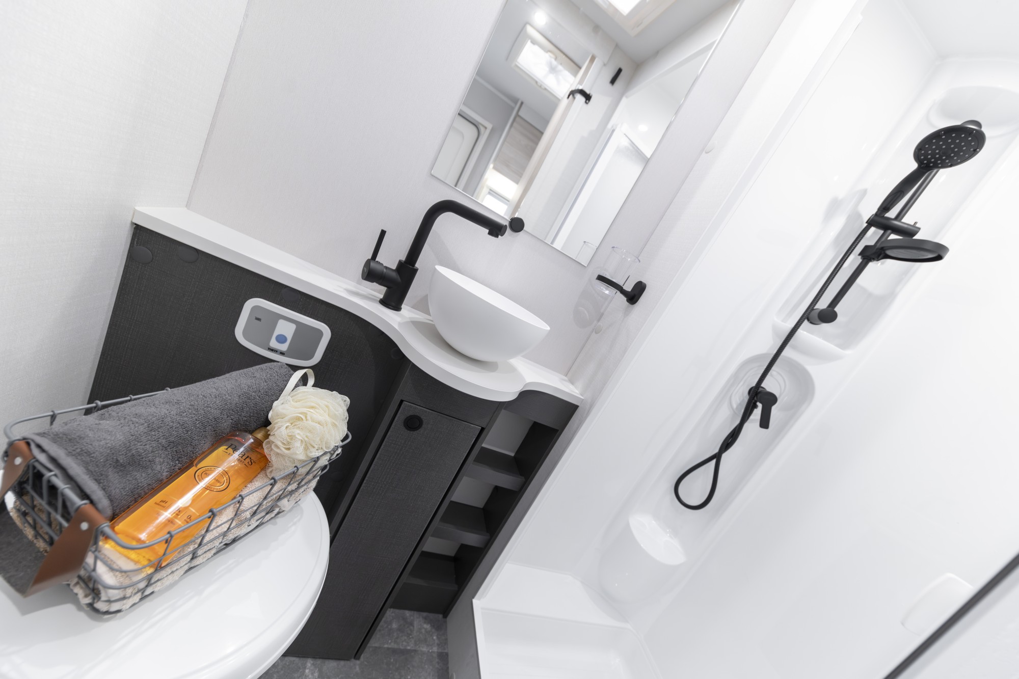 It’s a standard two-berth layout with an end kitchen, but that end kitchen, with its white worktop, stylish black tap, and charcoal cupboards, wouldn’t look out of place in a city apartment. Neither would the grey upholstery. There’s a sizeable wardrobe, too, so the two of you would never have to skimp on clothing.